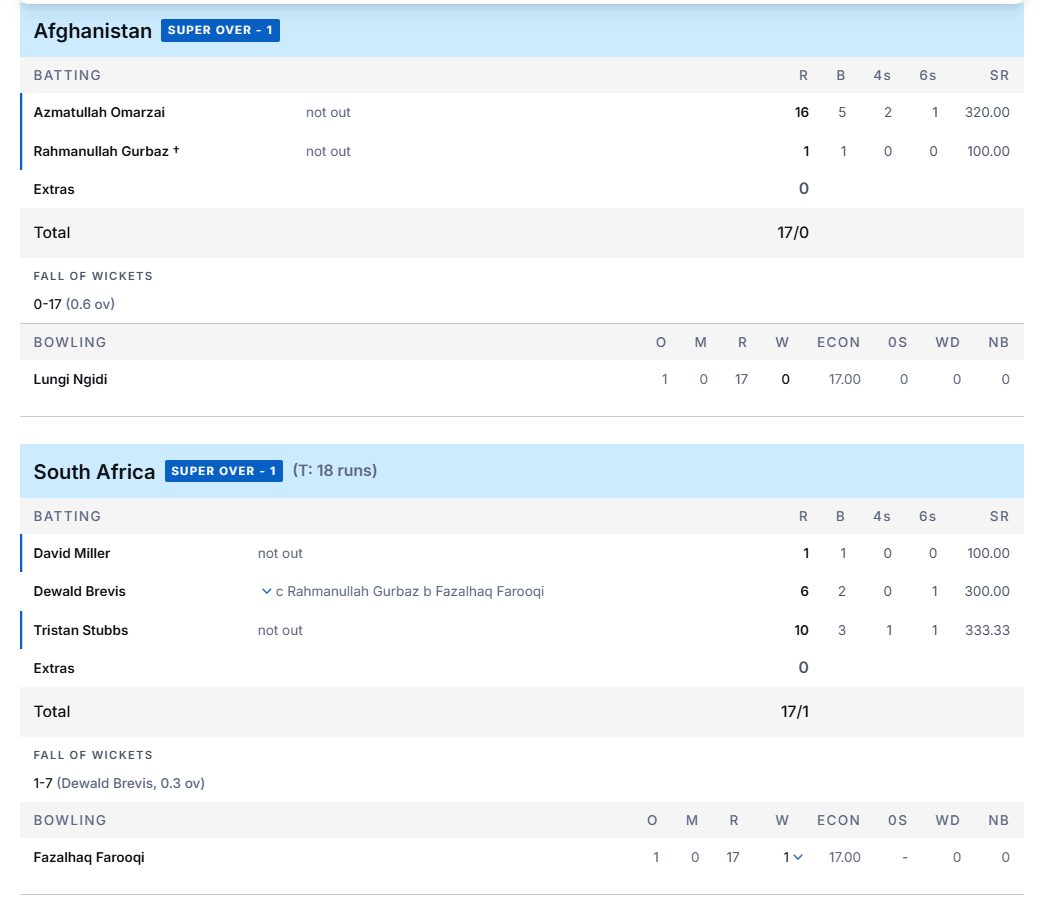 | Afghanistan Super Over – 2 (T: 24 runs) | ||||||